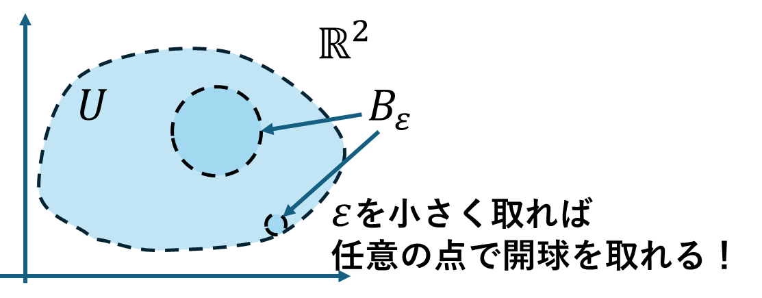 2次元ユークリッド空間上の任意の集合\(U\)の点\(x\)を中心とする開球を取ることができるとき、その集合を開集合と定義します。