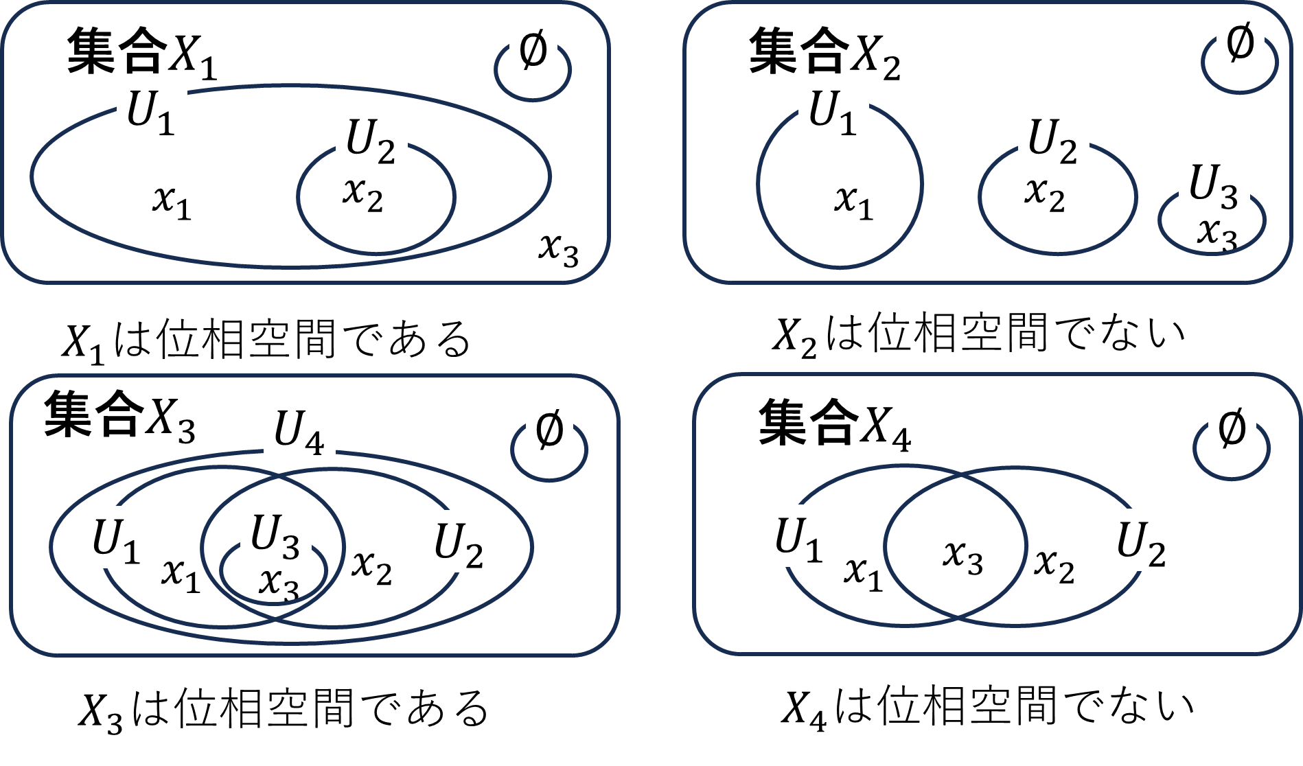 ぱっと見るとどの空間(集合)\(X_1,X_2,X_3,X_4\)が位相空間になっているか見ていきます。位相空間になっているのは、\(X_1,X_3\)だけです。ルール2、3を満たしているか列挙するのは大変なので、なにがだめで位相空間になっていないかを見ていきます。\(X_2\)では、\(U_1\cup U_2\)となる集合がありません。同様に