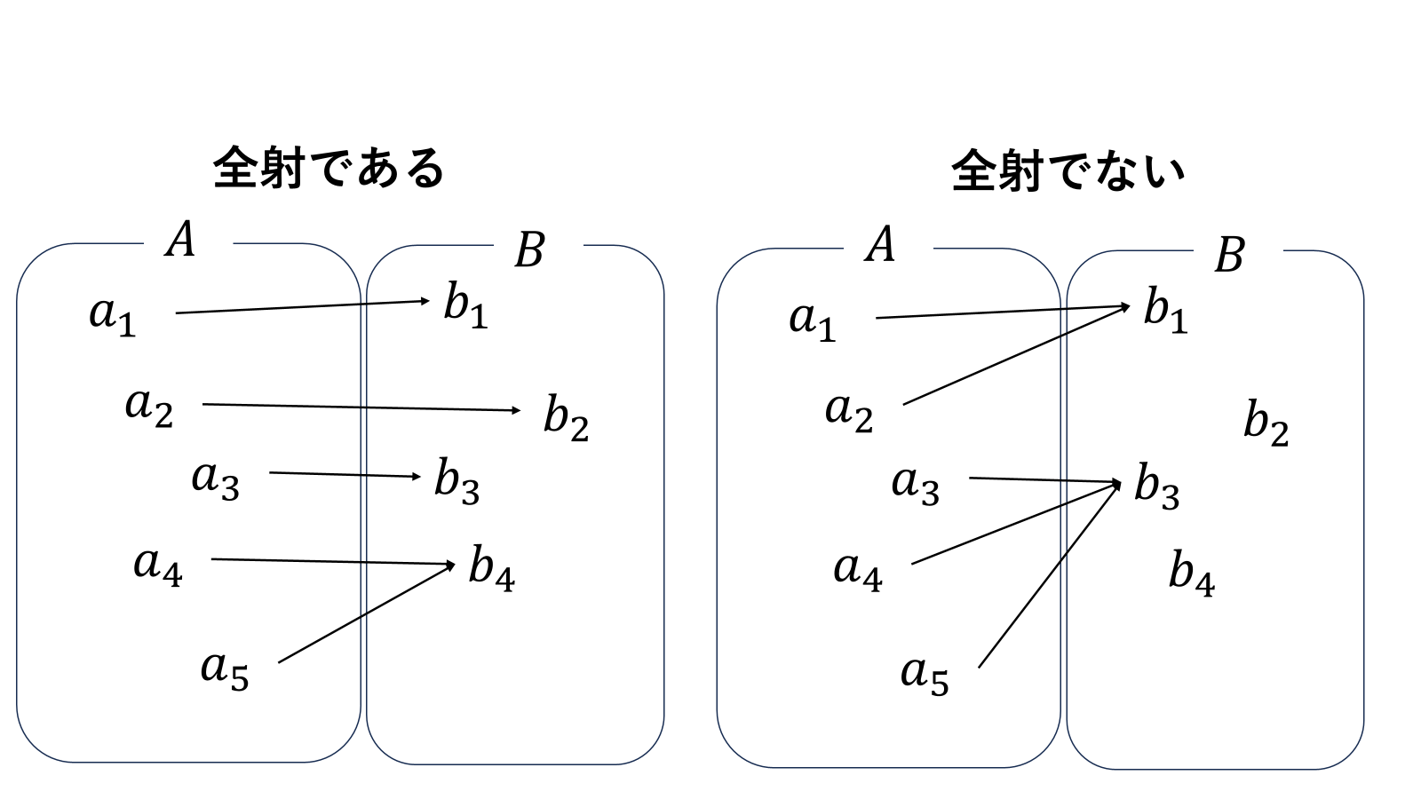 全射は、図のように、集合\(B\)の任意の元から、写像の始点(複数でもよい)が存在することを言います。