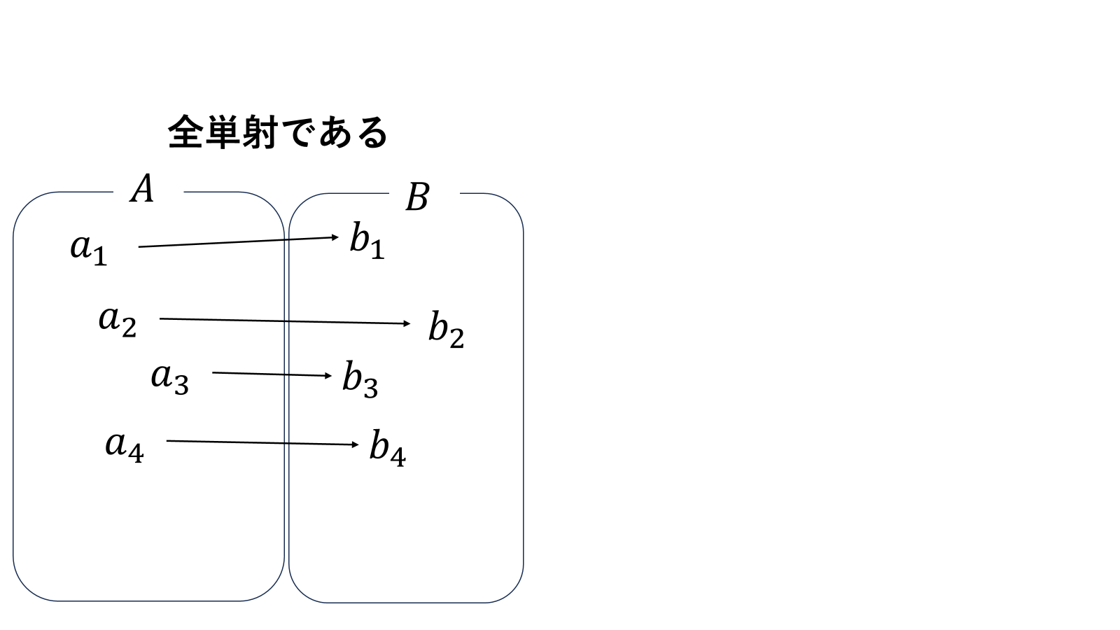 図のように単射は、集合\(A\)の任意元について、写像の終点が異なることを言います。