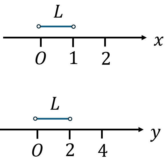 この結果はもちろん正しいですが、積分の定義が座標に依っているという見方もできます。開線分\(L\)に以下のような座標軸\(x,y\)で測って、関数\(f:L\to\mathbb{R}\)の積分を