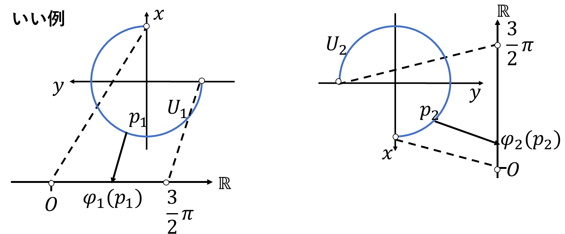 円周\(S^1\)少なくとも2つのチャートが必要になります。積分をするためには座標が必要なので、チャート上で積分をしなければなりません。