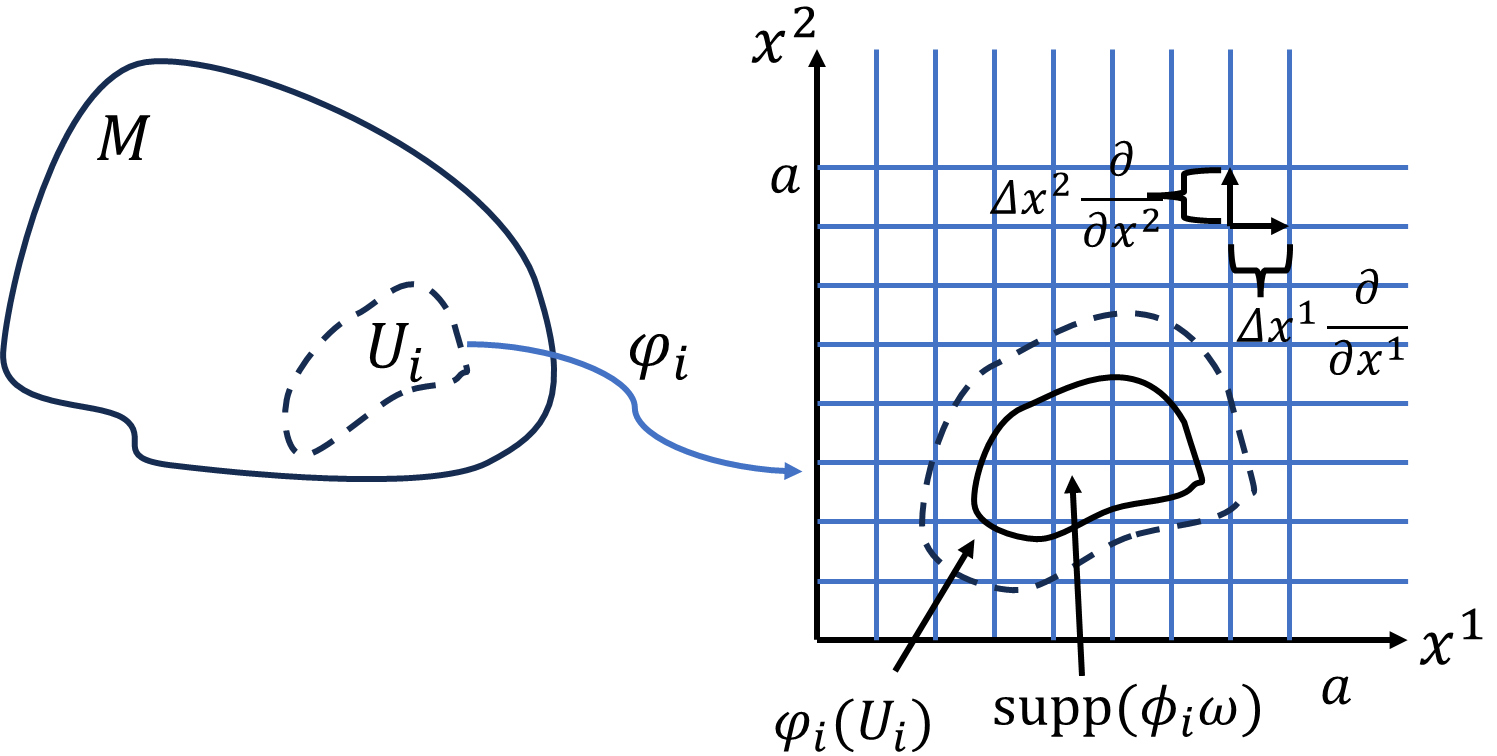 \(\rho,\lambda\)を0から\(n\)まで足し合わせると、\(\varphi_i(U_i)\)での積分値でなく、\([0,a]\times[0,a]\)でのリーマン和になってしまいます。しかし、\(\varphi_i(U_i)\)の部分だけの細長い長方形の体積の総和を取るのは面倒です。ここで輝くのが1の分割\(\phi_i\)です。\(\mathrm{supp}(\phi_i\circ\varphi_i^{-1}(x^1,x^2))\subset\varphi_i(U_i)\)一の分割は、\(U_i\)の外では0、局所座標に持ち込んでも\(\phi_i\circ\varphi_i^{-1}\)は、\(\varphi_i(U_i)\)の外で0です。これを微分形式にかけることで、\(\mathrm{supp}(\phi_i\omega)\subset U_i\)、なぜそのように言えるかというと、微分形式は、多様体全体で値を持つかもしれませんが、\(\phi_i\)は\(U_i\)の外で0、微分形式が値を持っていても0をかけることで0となるのです。