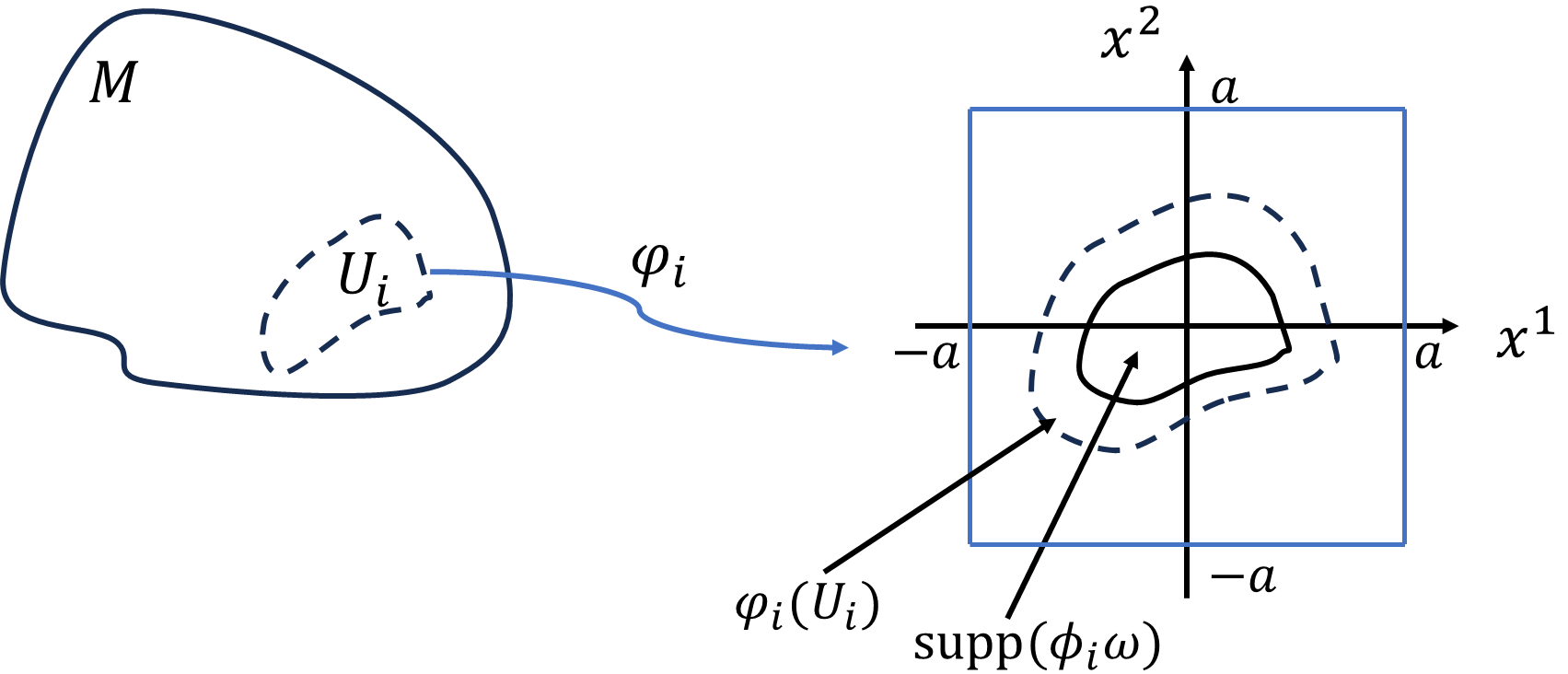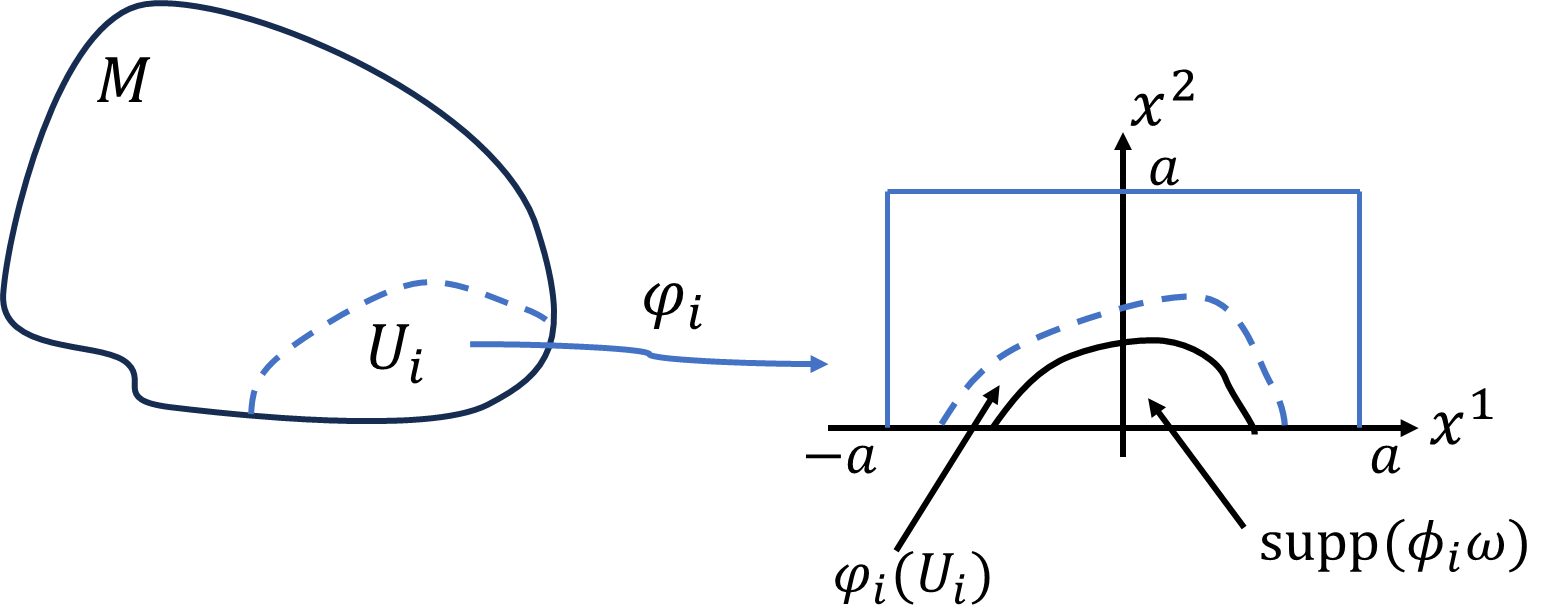 \(U_i\)は、2次元ユークリッド空間上の開集合\(\varphi_i(U_i)\)と同相です。定数\(a\)を十分大きく取ることで、\(\varphi_i(U_i)\subset[-a,a]\times[-a,a]\)とすることができます。\(\phi_i\omega\gt0\)である、\(\mathrm{supp}(\phi_i\omega)\)の範囲での積分のみが積分値に寄与するので、積分範囲を広めに正方領域\([-a,a]\times[-a,a]\)でとっても良いです。