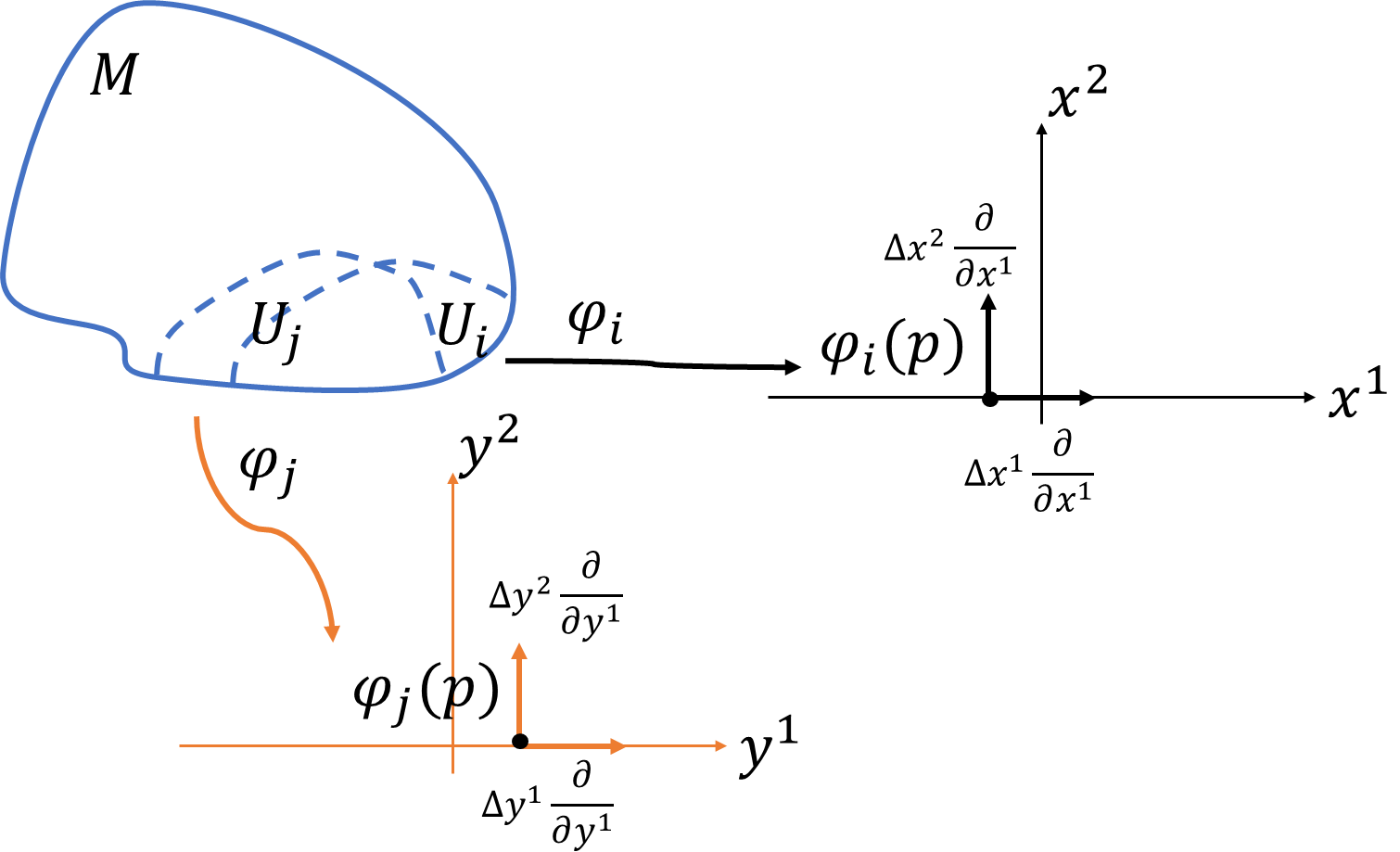多様体\(M\)の重なりのある開被覆\(U_i,U_j\)について、それぞれの局所座標を\(\varphi_i=(x^1,x^2),\varphi_j=(y^1,y^2)\)とすると、座標変換\(\varphi_j\circ\varphi_i^{-1}\)を