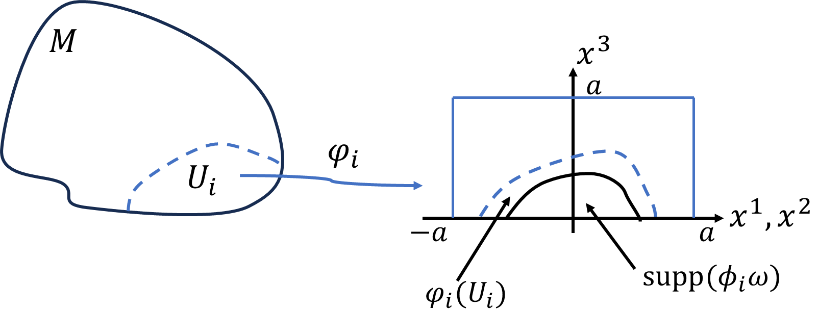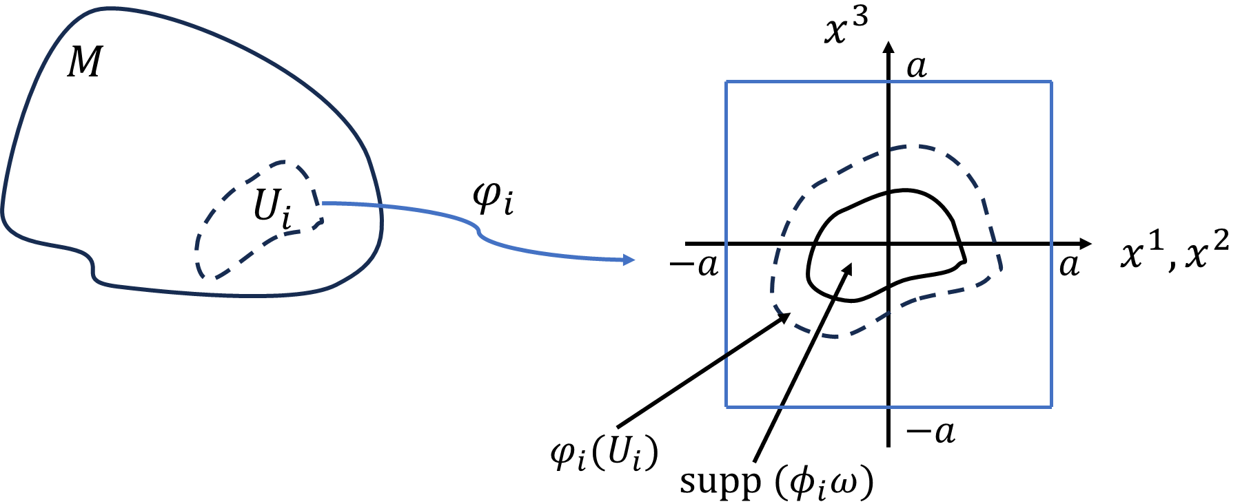 内の開集合\(\varphi_i(U_i)\)とに写されます。ただし、境界部分\(\partial M\cap U_i\)は、\(x^m=0\)の\(m-1\)次元ユークリッド空間\(\mathbb{R}^{m-1}\)内の開集合\(\varphi_i(\partial M\cap U_i)\)に同相とします。積分範囲は、\(\varphi_i(U_i)\)ですが、\(\mathrm{supp}\phi_i\subset \varphi_i(U_i)\)なので、積分範囲を\([-a,a]^{m-1}\times[0,a]\)まで積分範囲を広げても積分値は変わらないので、
