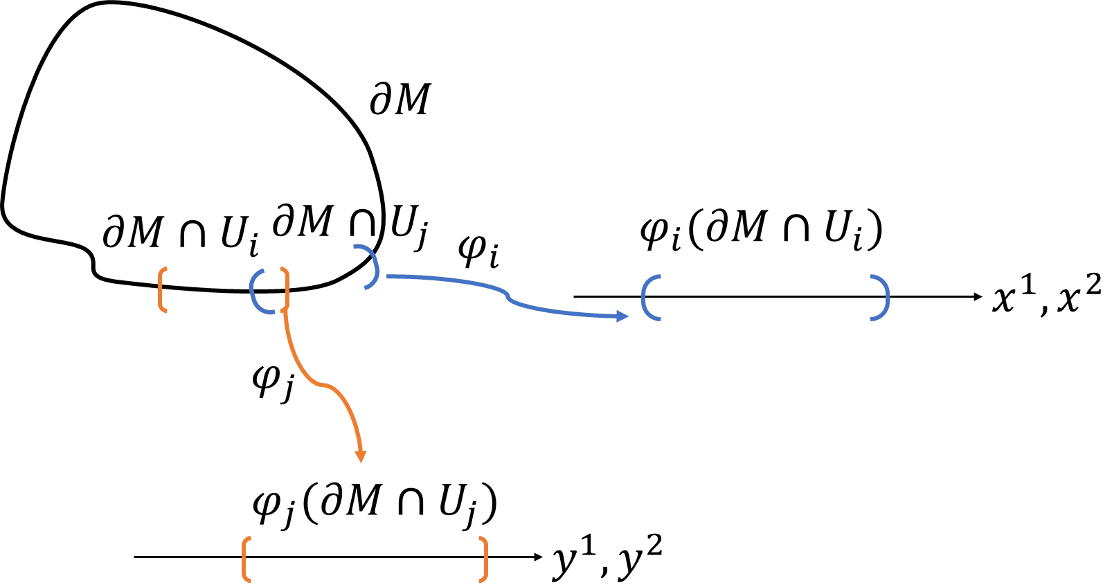 もともとの多様体\(M\)のアトラス\(\{U_i,\varphi_i\}_{i=1}^k\)から境界\(\partial M\)に制限したものを採用します。\(\partial M\)は\(2\)次元多様体なので、局所座標は、\(2\)次元ユークリッド空間になります。境界部分で重なりを持つ開被覆\(\partial M\cap U_i,\partial M\cap U_j\)の局所座標をそれぞれ\(\varphi_i|_{\partial M}=(x^1,x^2),\varphi_j|_{\partial M}=(y^1,y^2)\)とします。座標変換を