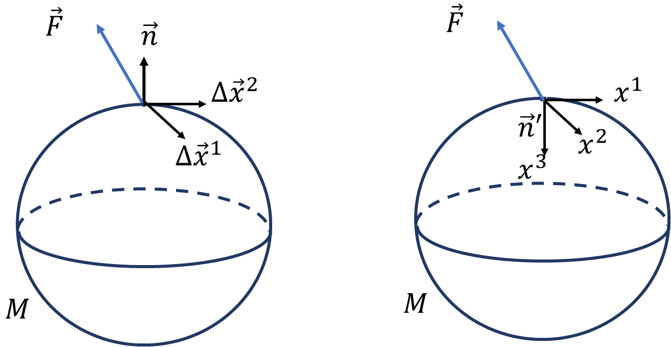3次元空間の図形\(M\)の境界\(\partial M\)は曲面で、法線ベクトル単位\(\vec{n}\)は\(M\)の外側向きにとるのが普通です。\(\partial M\)の表面は、外側と決められています。ベクトル場\(\vec{F}\)と内積を取って、\(\vec{F}\cdot\vec{n}\)面積要素をかけて、\(M\)上で足し合わせる計算を面積分\(\int_{\partial M}\vec{F}\cdot\vec{n}dS\)と呼びます。この視点から上半空間は、図形\(M\)の内側に第3軸を取るので、\(\partial M\)の法線単位ベクトル\(\vec{n}'\)は、従来の面積分と逆です。