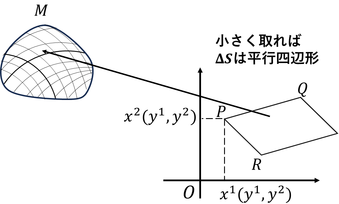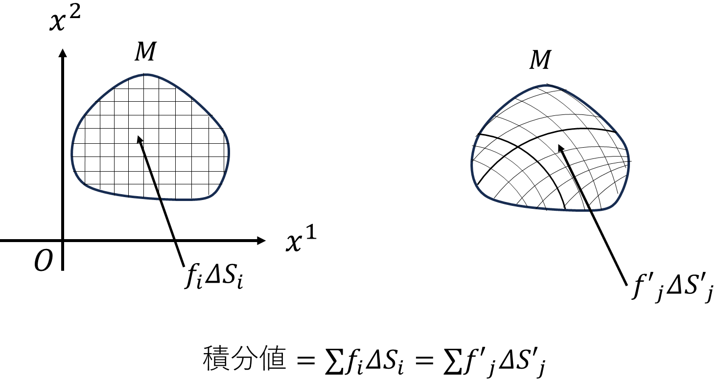 と書くこともできます。実際に積分をする際は、図形\(M\)が、座標\((x^1,x^2)\)や、\((y^1,y^2)\)でどのように表せるか注意が必要です。