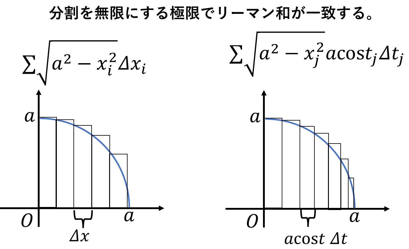 リーマン和をなす長方形の底辺を\(\varDelta x_i\)から、\(a\cos t_j\varDelta t_j\)に変えたという見方もできます。