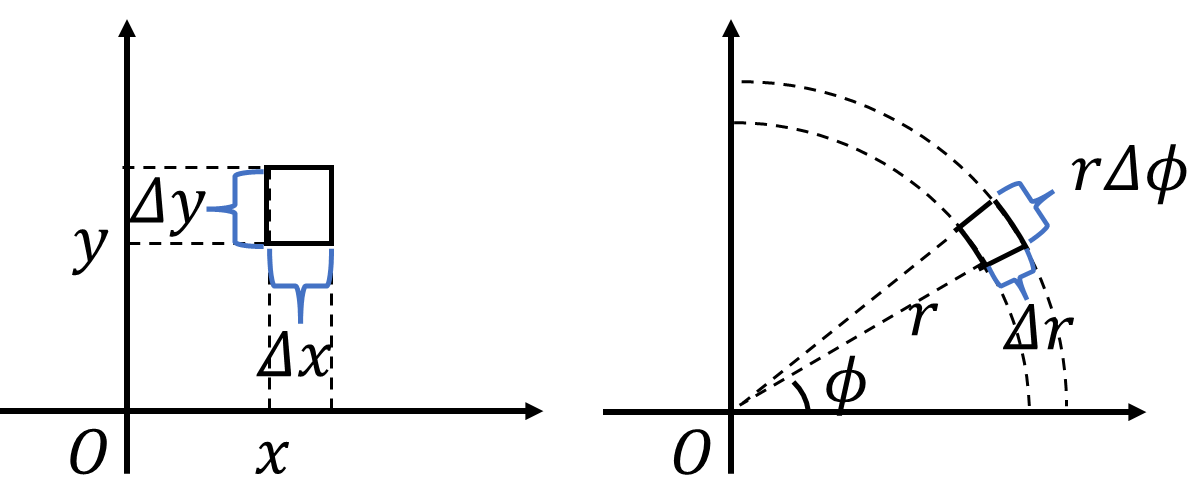 ただの積分同様に重積分でも面積要素を作るときの分割の仕方の違いと考えることができます。\(r\)が中心にいくにつれて0に近づくので、ヤコビアンを面積要素の拡大率みたいにとらえることもできます。