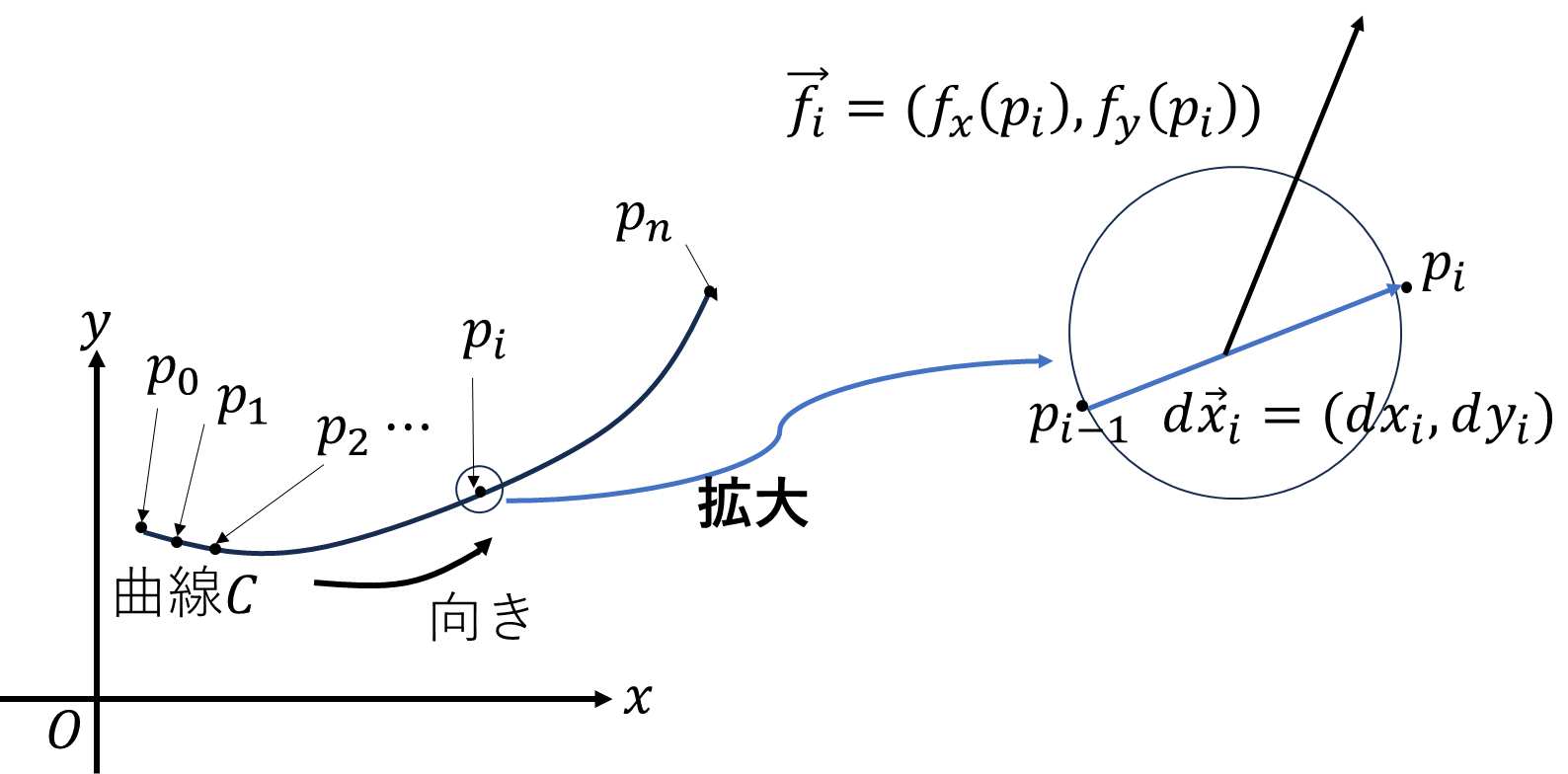 \[\int_C(f^xdx+f^ydy):=\lim_{n\to\infty}\sum^n_{i=1}\vec{f}_i\cdot\varDelta\vec{x}_i\]