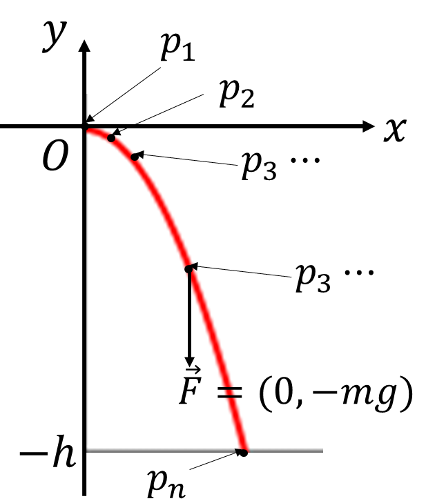 例として投げ出された物体が重力から受ける仕事を線積分で求めてみます。ベクトル場(定ベクトルですが、)\(\vec{F}=(0,-mg)\)の曲線\(C\)