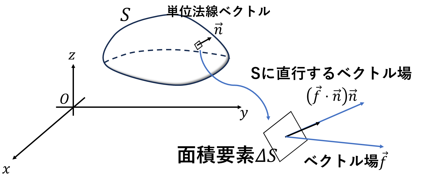 面積要素\(\varDelta S_i\)は\(S\)を\(n\)分割したうちの1つです。記号節約のため\(\varDelta S\)で分割の範囲、分割の面積の大きさの両方表します。\(\vec{f}_i,\vec{n}_i\)は\(\varDelta S_i\)の中での\(\vec{f},\vec{n}\)です。