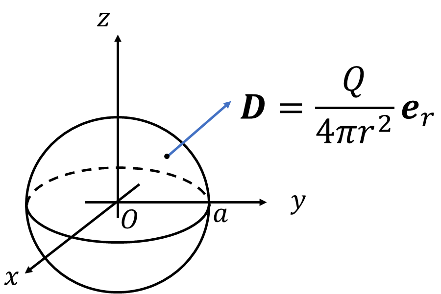 を面積分して見ます。\(\vec{D}\)は点電荷が作る電束密度と呼ばれる物理量です。球面の法線ベクトル\(\vec{n}\)は動径方向の単位ベクトル\(e_r\)に等しいです。\(\vec{n}=e_r\)また\(S\)上では常に\(r=a\)なので、\(\vec{D}\cdot\vec{n}=\frac{Q}{4\pi a^2}e_r\cdot e_r=\frac{Q}{4\pi a^2}\)以上から