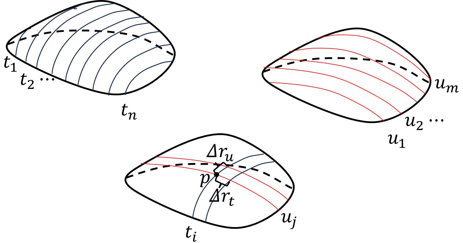 曲面上\(S\)の点\(p\)は直交座標であれば、タテ\(x_p\)、ヨコ\(y_p\)高さ\(z_p\)の3つの情報が必要に思われます。しかし、ある変数\(t\)によって曲線を1つ決まり、また別の変数\(u\)によってまた別の曲線が1つ決まる状況を考えれば少なくとも2つの曲線を決めればその交点を\(p\)とすることで、曲面上の点\(p\)は\(t,u\)の2つパラメータで決定できます。緯線と経線を決めるパラメータ2つで、地球表面の点を1つ決めれるみたいな感じです。(ただし変数\(t,u\)によって決められる曲線が一致しないなど、うまいこと曲線を選んであげる必要がありますが、)面積要素\(\varDelta S\)を\(\varDelta t=t_{i+1}-t_i,\varDelta u=u_{j+1}-u_j\)を使って表すこともできます。\(\varDelta t,\varDelta u\)は垂直とは限らないので、ただ積を取るのではなく、平行四辺形とみなして、計算しなくてはなりません。