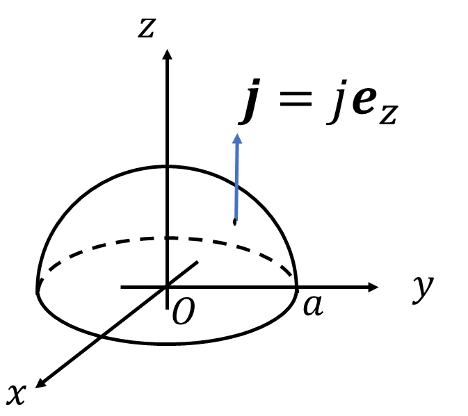 \(z\)方向の定ベクトル\(\vec{j}=0e_1+0e_2+je_3\)を図のような半球で面積分してみます。球面の法線ベクトルは常に動径\((r)\)方向なので、曲面上のベクトル場とみた\(\vec{j}\)との内積\(\vec{n}\cdot\vec{j}\)は一定ではないため計算には工夫が必要になります。ここでさっきの公式を使ってみましょう。