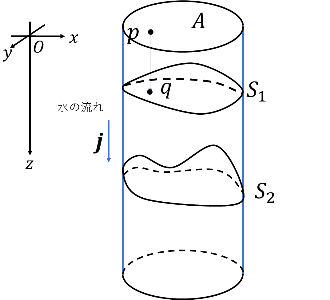 この水の断面を\(A\)、1秒辺りにこの断面を通過する水の体積(流量)を\(I\)とします。(厳密には円柱の縁近くと内側で若干違うかもしれません。)\(j:=I/A\)で定義される流量面密度と水の流れ方向の単位ベクトル\(\vec{n}\)の積で流量密度を定義します。